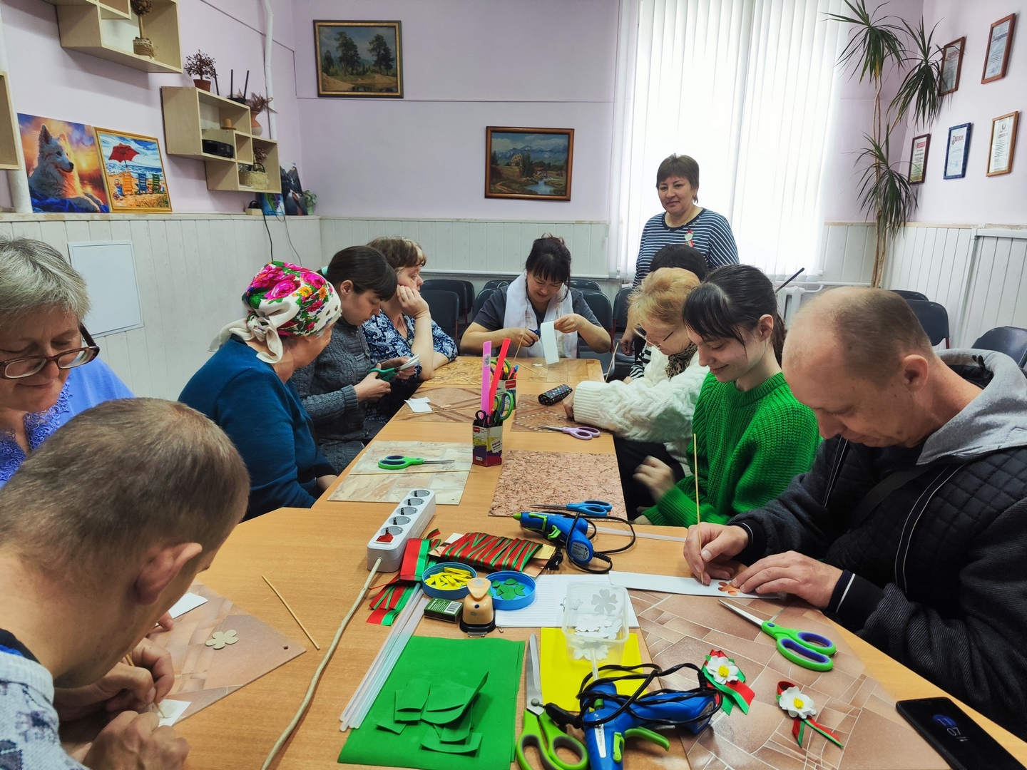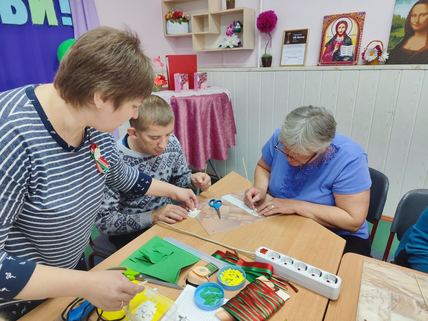 С целью патриотического воспитания, укрепления семейных ценностей, таких как уважение, забота, согласие, взаимовыручка, сплоченность, посредством совместного времяпрепровождения, для получателей услуг отделения социальной реабилитации, абилитации инвалидов Ивановского территориального центра и их родителей специалистами проведен мастер-класс «Семейный досуг. Цветы Великой Победы».