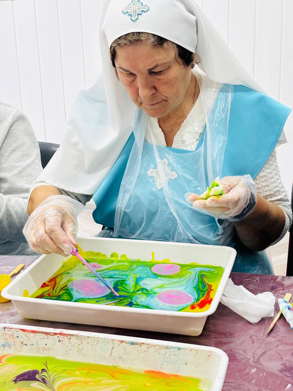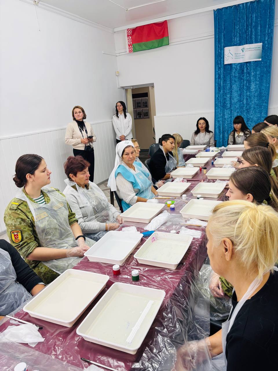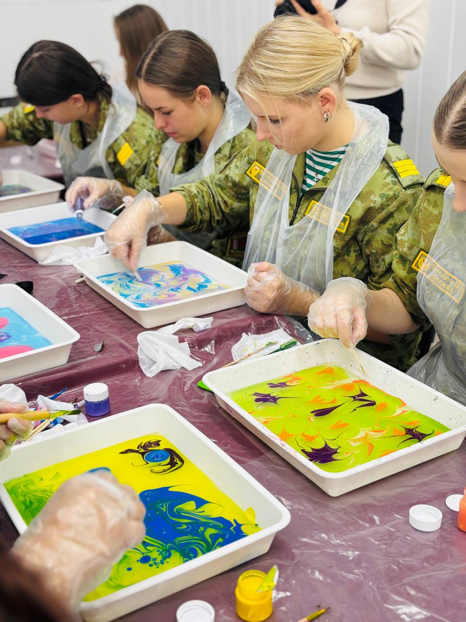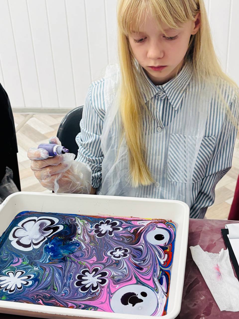Затем, после непродолжительной медитации под звуки лирической музыки, ребята и представители старшего поколения попробовали себя в роли художников. Они рисовали красками на поверхности воды в технике эбру. В зале царила атмосфера создания действительно чего-то прекрасного, объединяющего и облагораживающего.