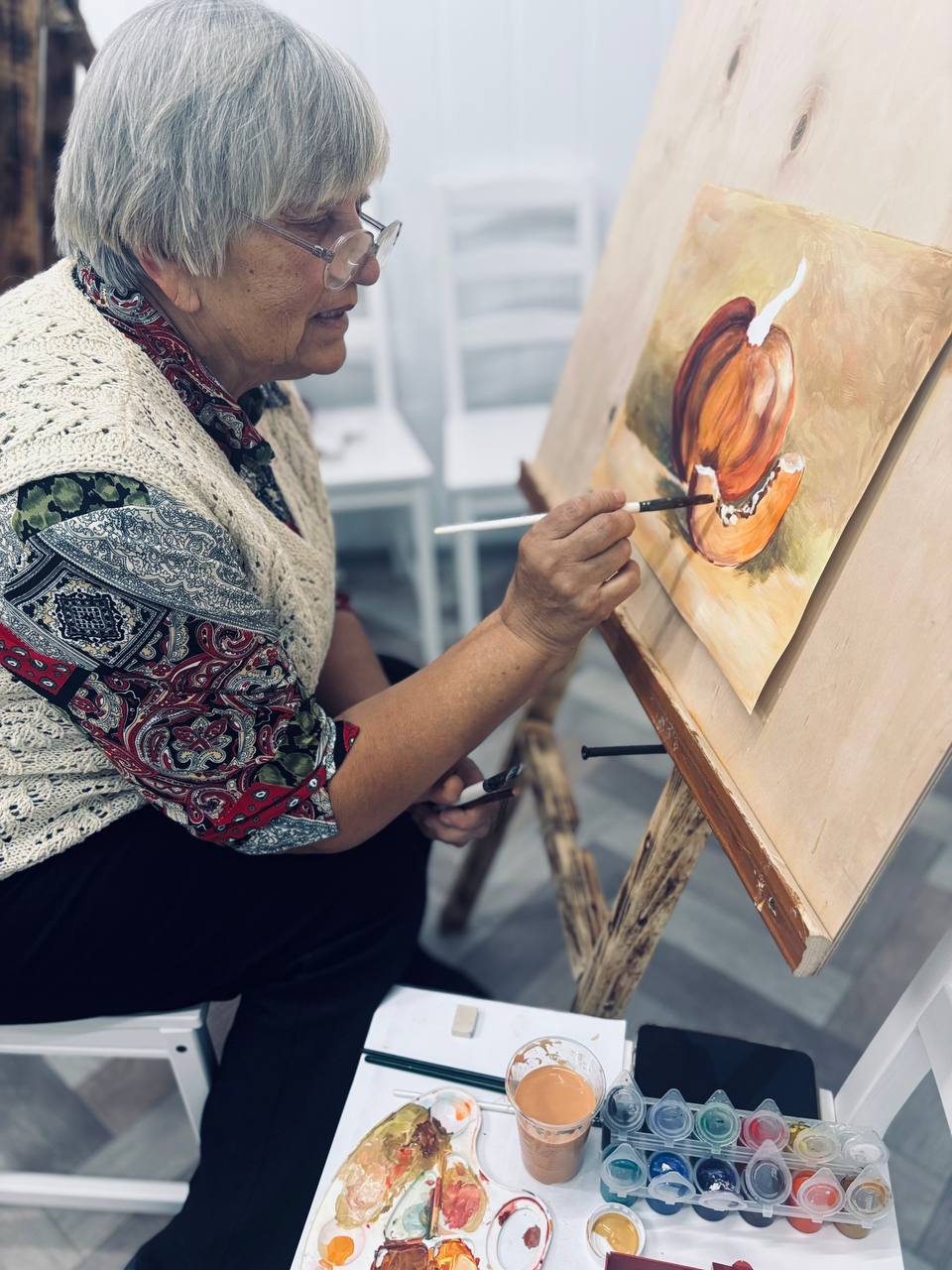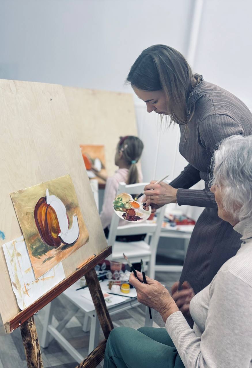 В рамках проекта «Краски поколений» с подопечными отделения комплексной поддержки в кризисной ситуации и обеспечения дневного пребывания для граждан пожилого возраста прошло практическое занятие по живописи. Под руководством волонтера Анны Олеговны Казак в дружелюбной и теплой атмосфере написан самый яркий атрибут осени –тыква. Каждая картина получилась яркой, уникальной и неповторимой.
