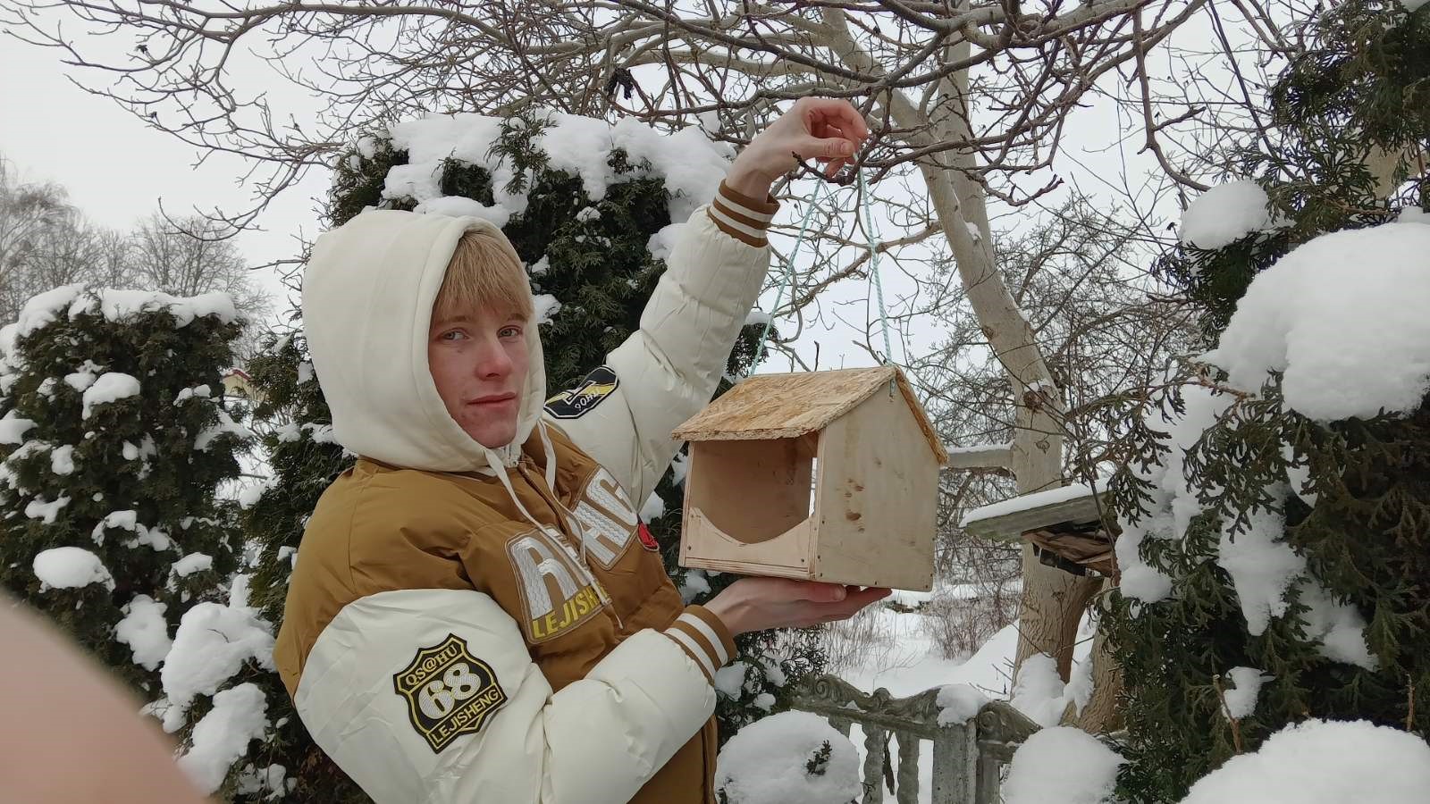 Ребята повесили на территории центра кормушку, насыпали в нее корм и с нетерпением ожидают пернатых гостей.