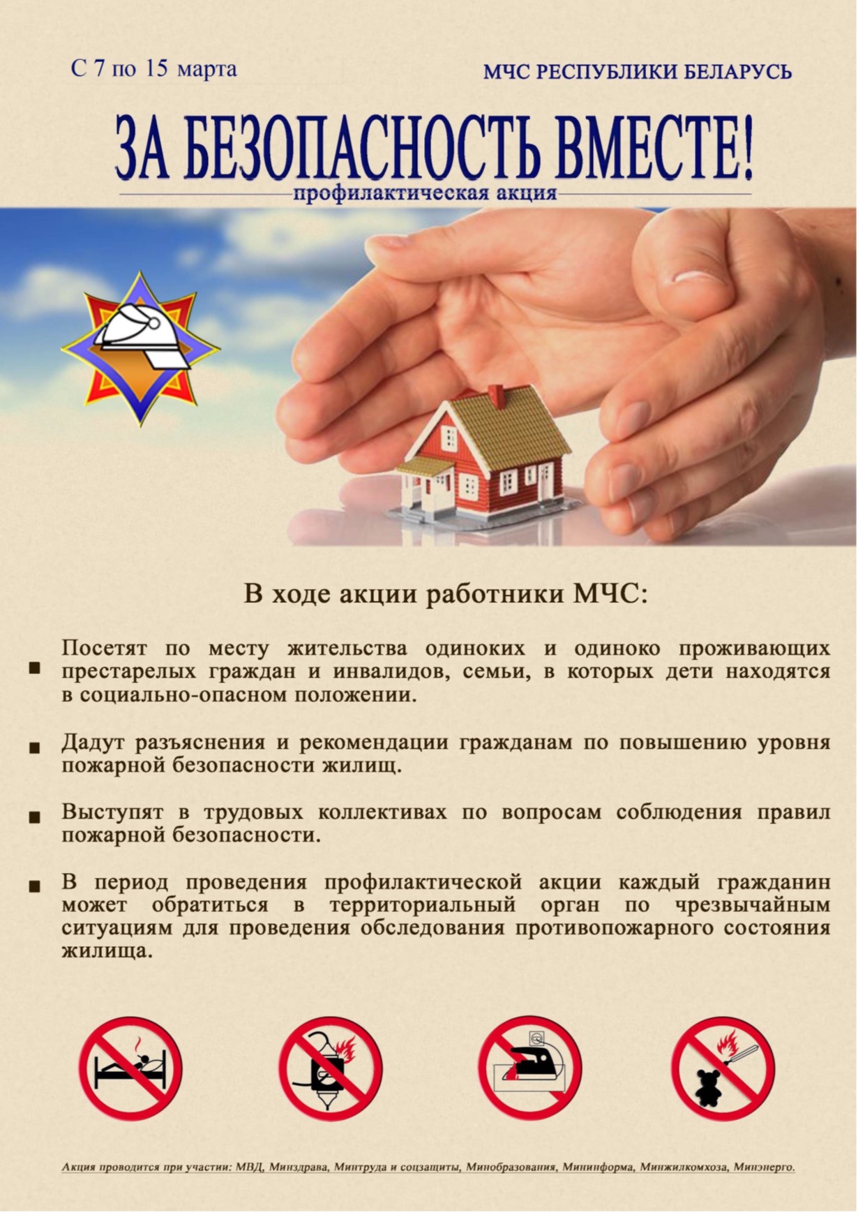 Для повышения уровня безопасности населения, координации деятельности субъектов профилактики правонарушений в области обеспечения пожарной безопасности, активизации пожарно-профилактической работы в период с 7 марта по 15 марта 2026 г. проводится республиканская профилактическая акция «За безопасность вместе».