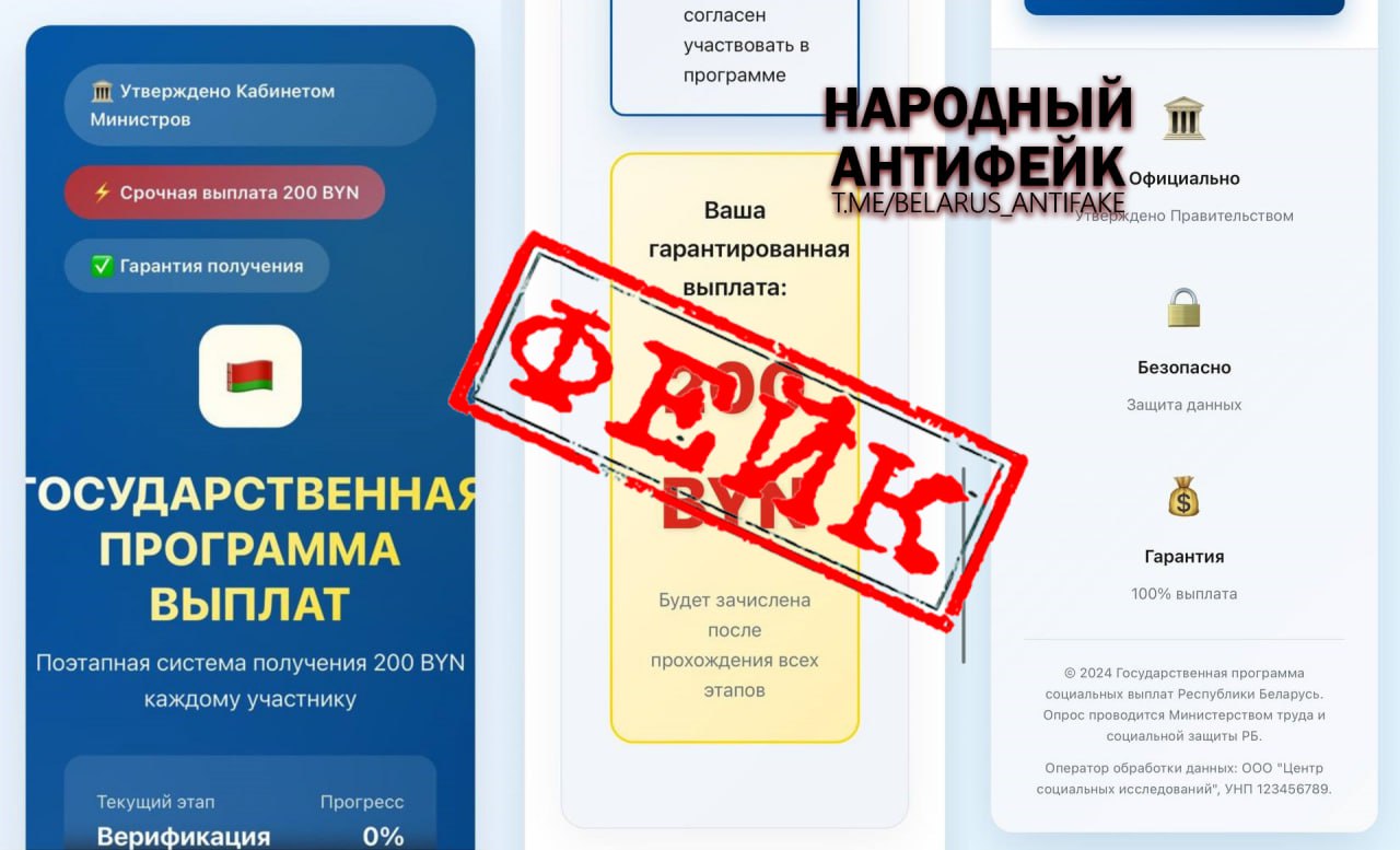 Шарлатаны обещают гарантированно выплатить 200 BYN за прохождение простого опроса, ссылаются на «одобрение Совмина» и «официальную программу», но это все развод. После перехода по ссылке у вас украдут личные данные.